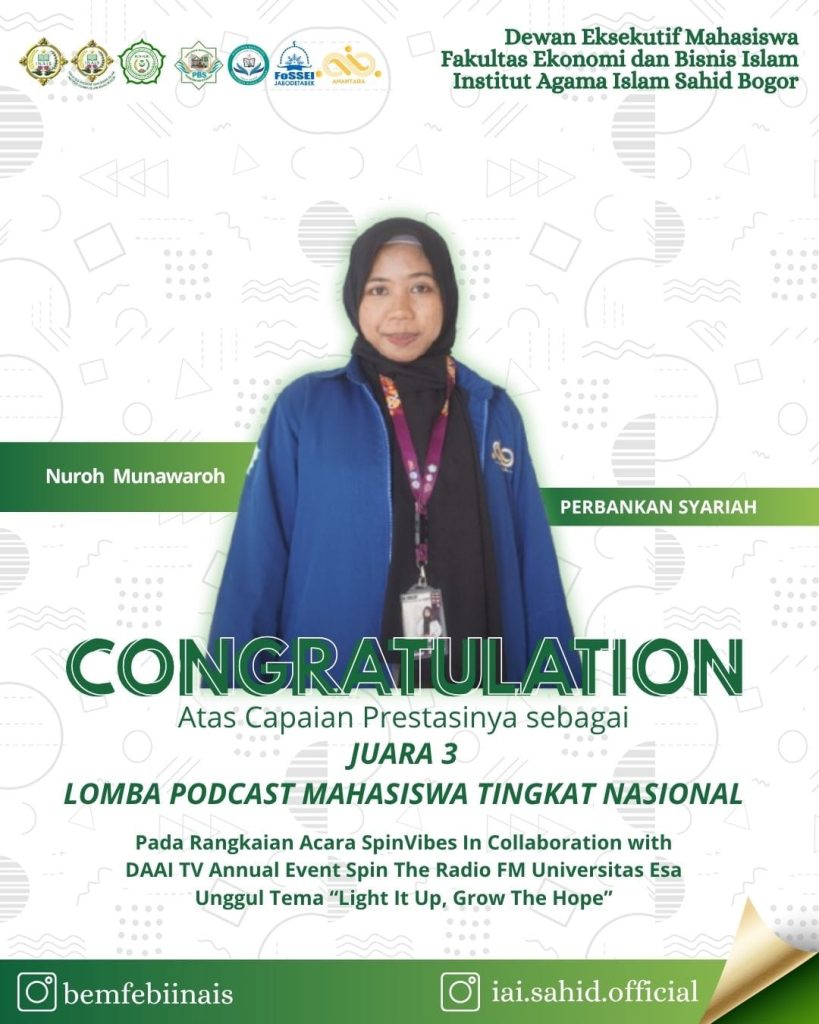 Oleh: Redaksi DEMA FEBI INAIS Bogor Tanggal: 15 Oktober 2025 Bogor – Kembali, nama Fakultas Ekonomi dan Bisnis Islam (FEBI) Institut Agama Islam Sahid Bogor menggema di kancah nasional. Nuroh Munawaroh, mahasiswi Program Studi Perbankan Syariah, berhasil meraih Juara 3 Lomba Podcast Mahasiswa Tingkat Nasional dalam rangkaian acara SpinVibes, kolaborasi eksklusif antara DAAI TV dan […]