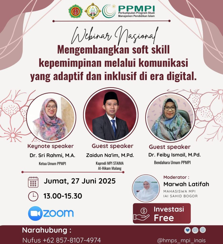 Bogor – 21 Juni 2025Himpunan Mahasiswa Program Studi (HMPS) Manajemen Pendidikan Islam (MPI) Institut Agama Islam Sahid Bogor akan menyelenggarakan Webinar Nasional bertema:“Mengembangkan Soft Skill Kepemimpinan Melalui Komunikasi yang Adaptif dan Inklusif di Era Digital”Acara ini akan dilaksanakan secara daring pada Jumat, 27 Juni 2025, pukul 13.00–15.30 WIB melalui platform Zoom Cloud Meeting. Webinar ini […]